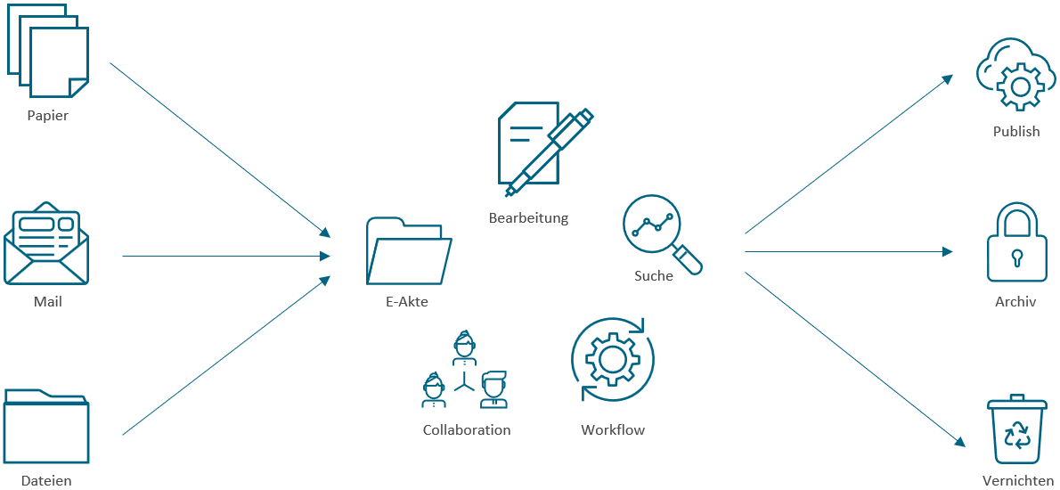 Enterprise Content Management (ECM) – oder auch Dokumentenmanagement genannt – verbindet die Erfassung und Verwaltung aller Arten von Dokumenten mit der gezielten Nutzung – digital, bedarfsgerecht und ausgerichtet auf Ihre Prozesse. Sammlung, Versionierung, digitale Akten, digitale Zusammenarbeit, Workflows und sichere Archivierung sind nur einige der Funktionsbereiche entsprechender Plattformen. So wird ECM ein wesentlicher Teil von Strategien zur Digitalisierung und Prozessverbesserung.