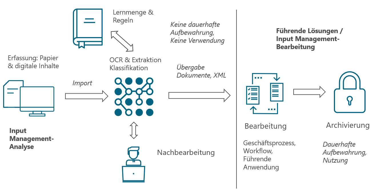 Input Management beschäftigt sich mit der Erfassung, Konvertierung und inhaltlichen Erschließung von eingehenden Informationen. So können beispielsweise Dokumente erfasst, inhaltlich klassifiziert und die für den Geschäftsvorfall relevanten Informationen extrahiert werden. Auf Basis der Ergebnisse lassen sich digitale Prozesse anstoßen und die Bearbeitung der zugehörigen Geschäftsvorfälle / Aufgabenstellungen steuern. Dabei werden unterschiedliche Kanäle und Formate unterstützt, bspw. die Verarbeitung von Papier, digitalen Dokumenten und E-Mails.