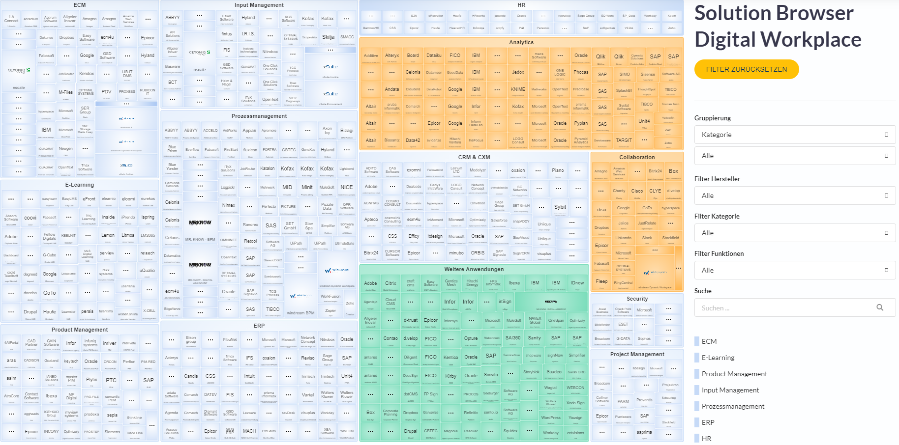 Der Solution Browser ermöglicht es Ihnen interaktiv verschiedene Softwarelösungen zu entdecken. Filtern Sie einfach nach Herstellern, Funktionen oder Kategorien, um so die für Sie relevanten Anbieter zu finden.