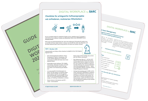 Laden Sie sich kostenfrei den BARC Guide Digital Workplace herunter: Dieses Handbuch mit Expertenbeiträgen zur Softwareauswahl und Prozessoptimierung ist der Wegweiser zum Arbeitsplatz der Zukunft.